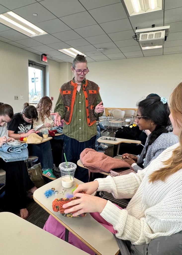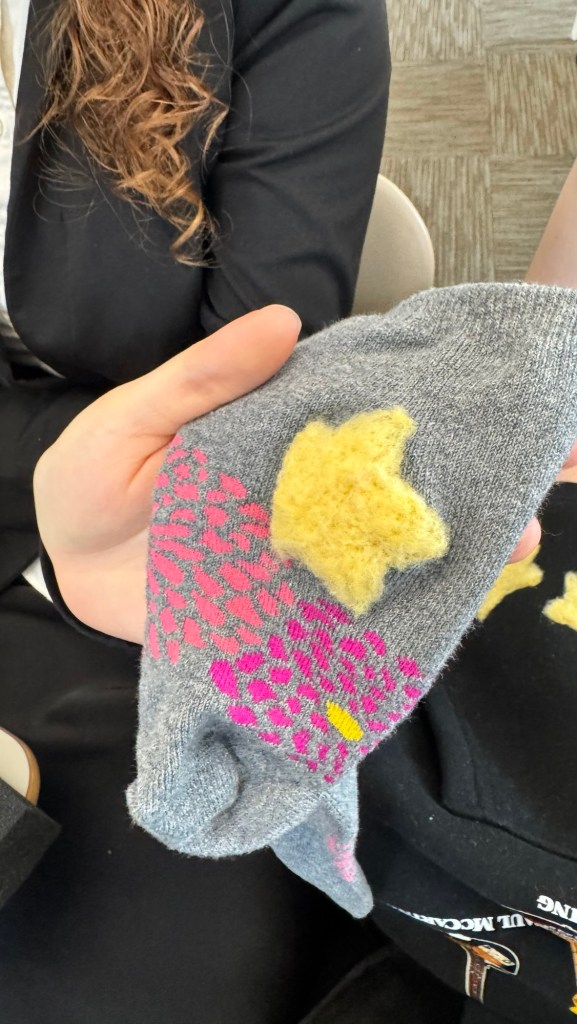 Here are some photos from our mending circle in her class where discussed “What unique perspective do you have from your learned life experiences?” – while mending and decorating our clothes and shoes with needle felting.