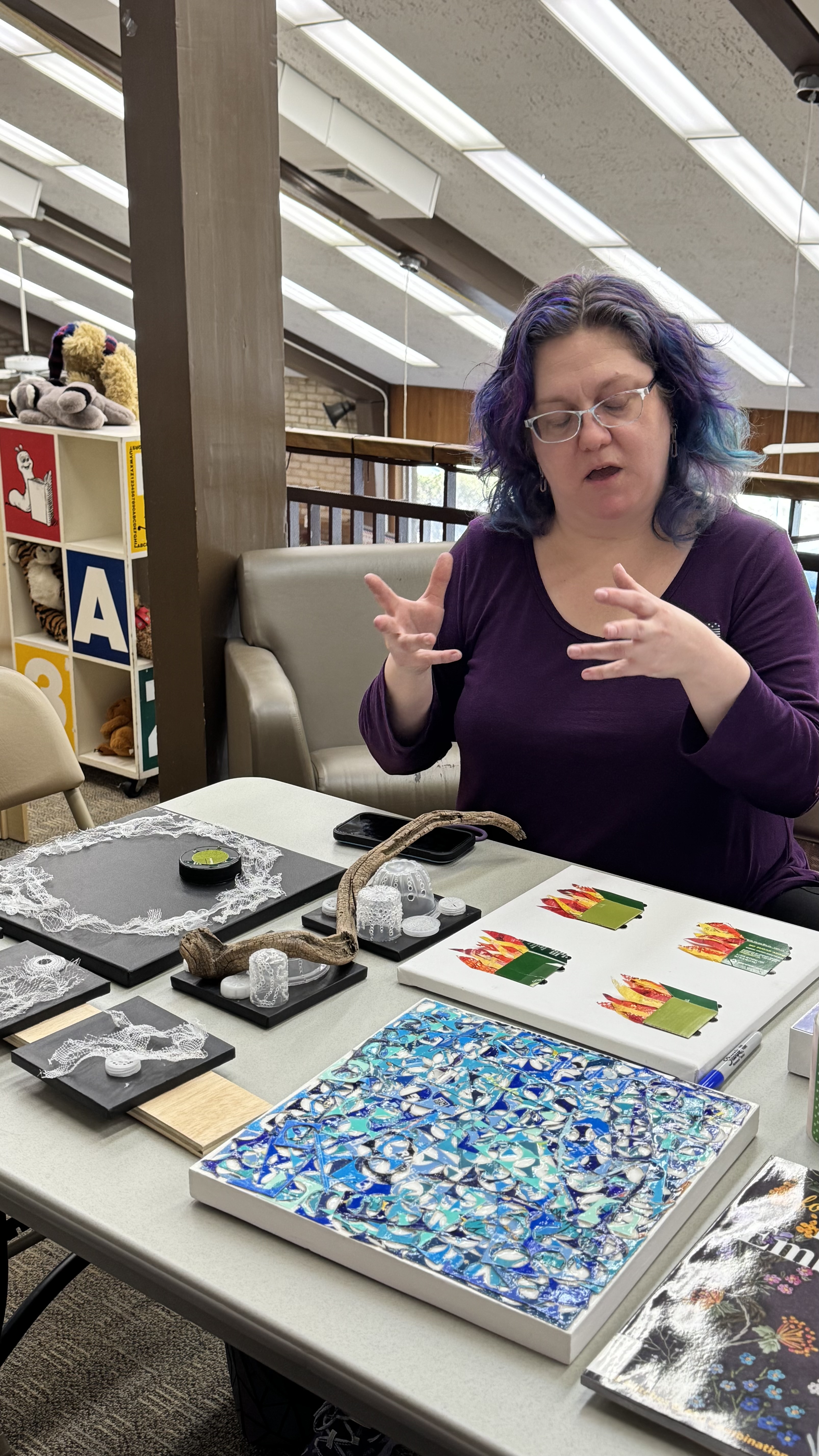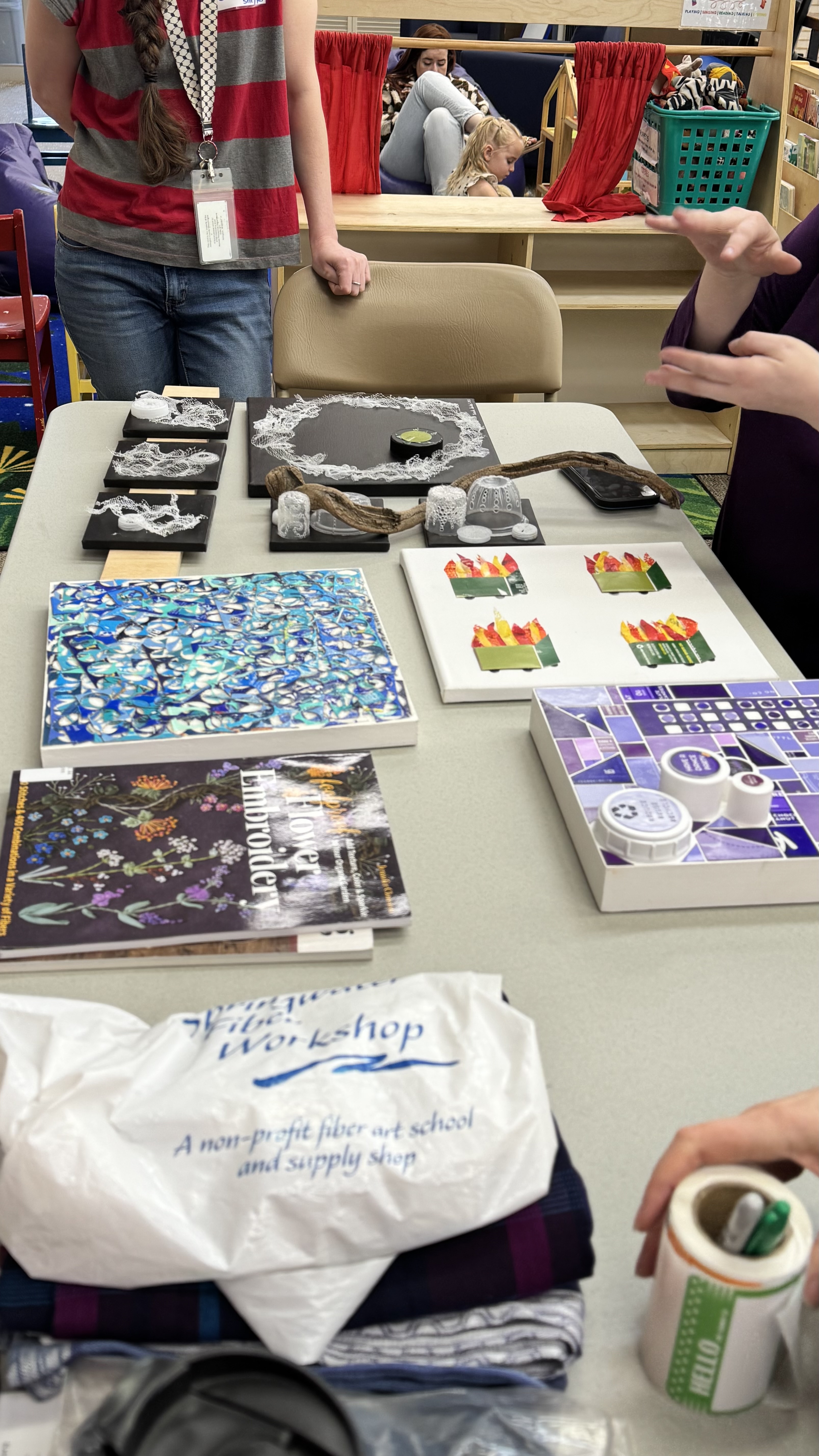 We gathered in circle as artist and activist Ursula Seckel joined us to share not just her art, but her way of seeing. There’s something quietly radical about Ursula’s practice: she looks at what’s been cast off and recognizes not waste, but possibility. Raised by two marine biologists and steeped in the rhythms and stories of the ocean, she carries that tidal sensibility into everything she creates. As she showed us her marine-inspired pieces, you could feel it—this invitation to reimagine, to return beauty to what’s been overlooked.